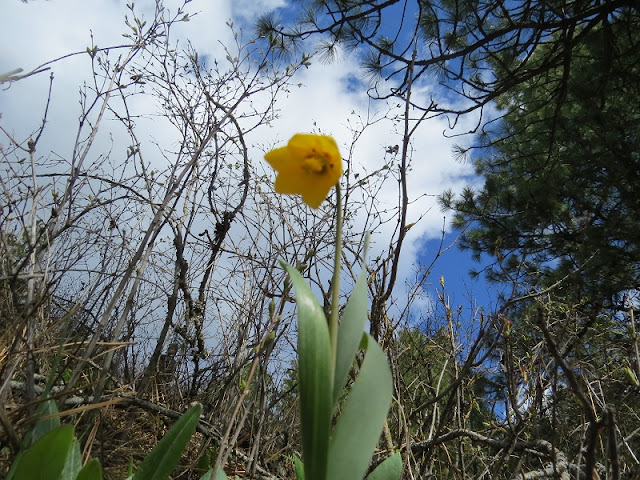 This and one other tulip are what are growing now. This is taken through the stems of the yellow rosebush seen below from last year.